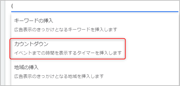 ①広告文作成の画面を開き、カウントダウンを表示する場所に「{ 」を入力します。プルダウンメニューで「カウントダウン」を選択します。