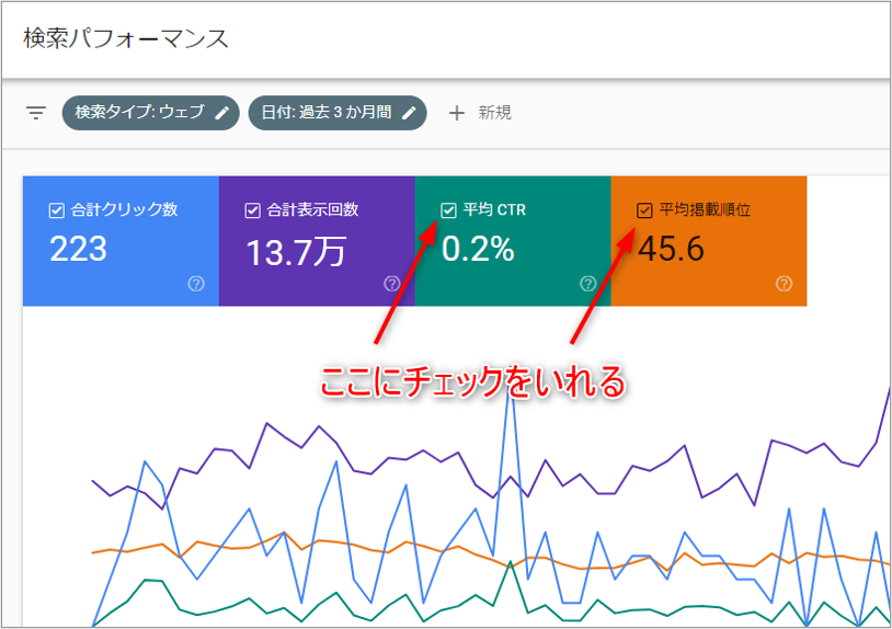 先程の中央画面の指標の「平均CTR」と「平均掲載順位」の□にチェックをいれます。