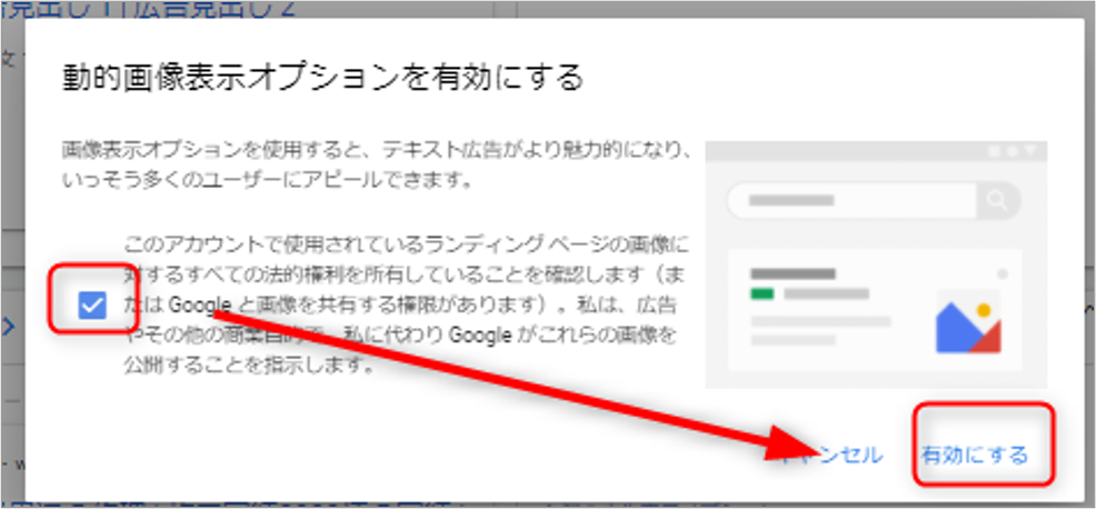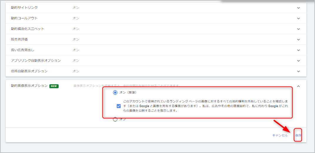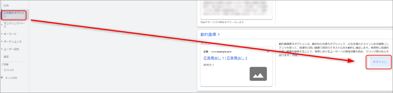 動的画像表示オプションを利用するためには「オプトイン」をする必要があります。オプトイン設定をオンにすると、ランディングページ内の画像の抽出が自動的に行われ、ユーザーの検索内容に対して最も的確な画像が選ばれます。キーワードや検索語句、広告のターゲティングなどを考慮した関連性の高い画像が表示されます。品質基準を満たしていない場合は表示されません。