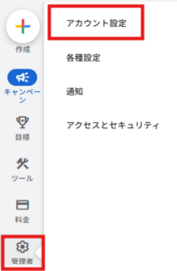 ①左メニューの管理者にカーソルを合わせると表示される「アカウント設定」をクリック