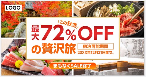 背景で情緒(景色など)を伝えつつ、まずお得さ・タイミングの良さを視覚的に訴求することでクリックを促します。コピーでは価格訴求を中心に据えることでクリック率が高まります!