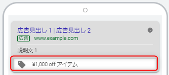 広告下部に商品やサービスの値引き情報を表示させられるオプションです。季節イベントによる割引情報などで広告を強調することが出来ます。検索結果ページの最上位または最下位に表示された時にのみ表示されます。