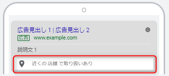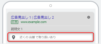 住所表示オプションと似た機能で、自社の商品を販売している店舗を広告で表示させる機能です。モバイル端末の場合は住所表示オプション同様店舗までの経路またはGoogleマップが表示されます。自社で経営している店舗などは住所表示オプションを使用します。