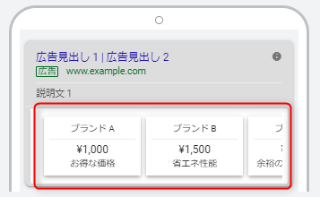 広告の下部に「●●3,000円」「□□5,000円」のような値段とリンク先をそれぞれ設定できます。表示された場合はカルーセルのようにスライドさせることができるので複数の商品ページに誘導することができます。ユーザーの関心があるページを選択できるのでコンバージョン率の向上が期待できます。