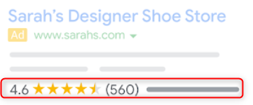 ユーザーの販売者への評価を広告内に表示できる機能です。一定の条件を満たすと、Googleカスタマーレビューや外部のデータ元から集められたレビューや評価などが表示されるようになります。飲食店などの他者評価の影響が大きい商材・サービスなどには有効的です。