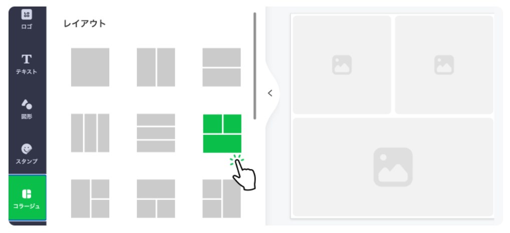「コラージュ」はエディターのサイドツールから利用でき、「コラージュ」を選択してフレームを選ぶとキャンバスに表示されます。スクエア以外のサイズでも利用が可能です。