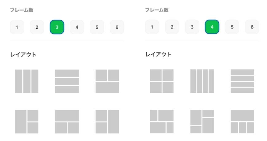 ◎【公式】LINE Creative Labからログインし、編集画面でフレーム数を選択すると、いろいろなレイアウトが表示されるので、使用したい画像枚数にあわせて選んでみましょう。