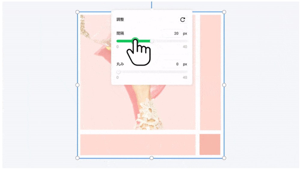 ◎フレームの編集エリアは、サイズや間隔、丸みの変更も可能です。