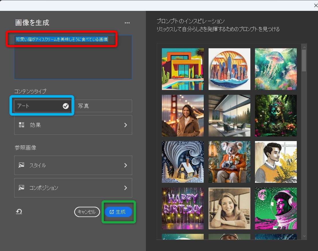 赤枠に今回作りたい画像の希望を日本語もしくは英語で記入します。