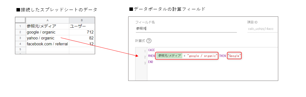 例としてGoogle Analyticsのデータを左に用意しましたが、こちらをインポートしてスプレッドシートで連携をすると、そのままの表記名で表示されます。ですが、CASE関数を使用することで右のように任意の文字列に変更することが出来ます。