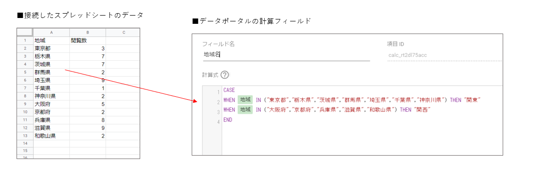 例として都道府県別のレポートを左に用意しました。CASE関数を使用することでデータポータル内で任意のグルーピングをして表示させることが出来ます。例は都道府県ですが、メーカー別やブランド別に実績を表示させたいときにも活用できます。