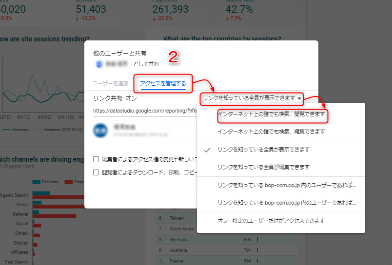 先程行った埋め込みの方法ですと、インターネット上の誰でも閲覧ができる状態ですが、特定のユーザーにのみレポートを表示させたい際は、②設定時にレポートを共有したいユーザーを追加します。これで、共有されていないユーザーがページを開くと、下記のような画面になり表示されなくなります。