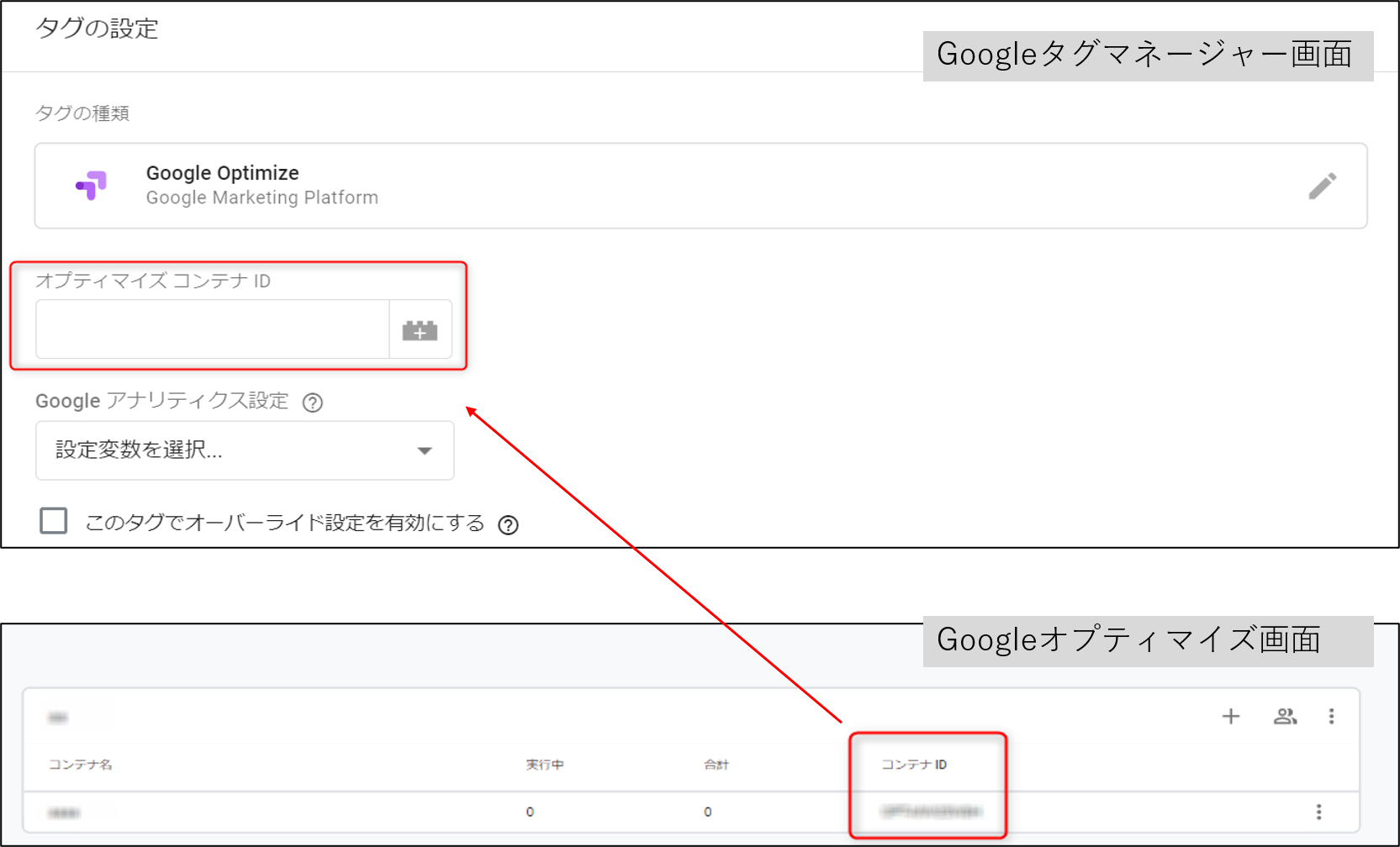 ④Google オプティマイズの入ってすぐの画面で、コンテナIDがあるのでそちらを先程のアナリティクスIDの部分に入力して、後はGTMタグの設定をして完了です。