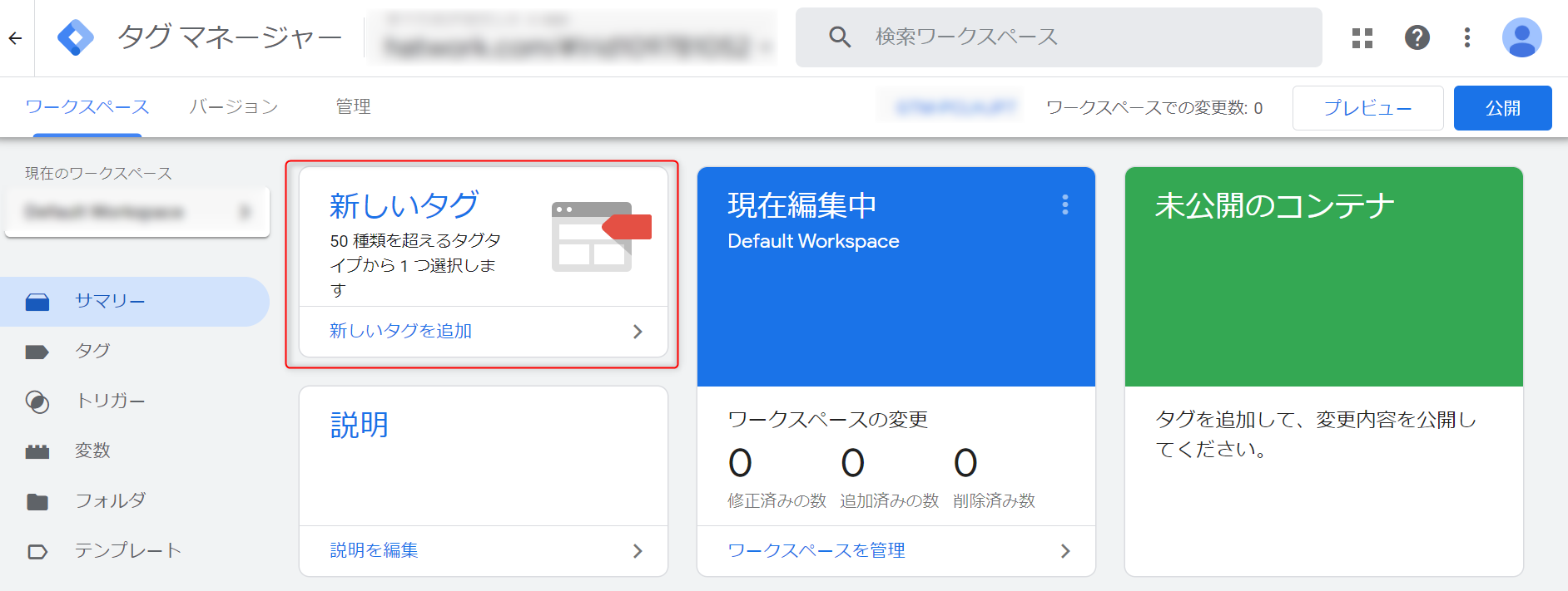 ①Googleタグマネージャーを開き「新しいタグ」を選択します。