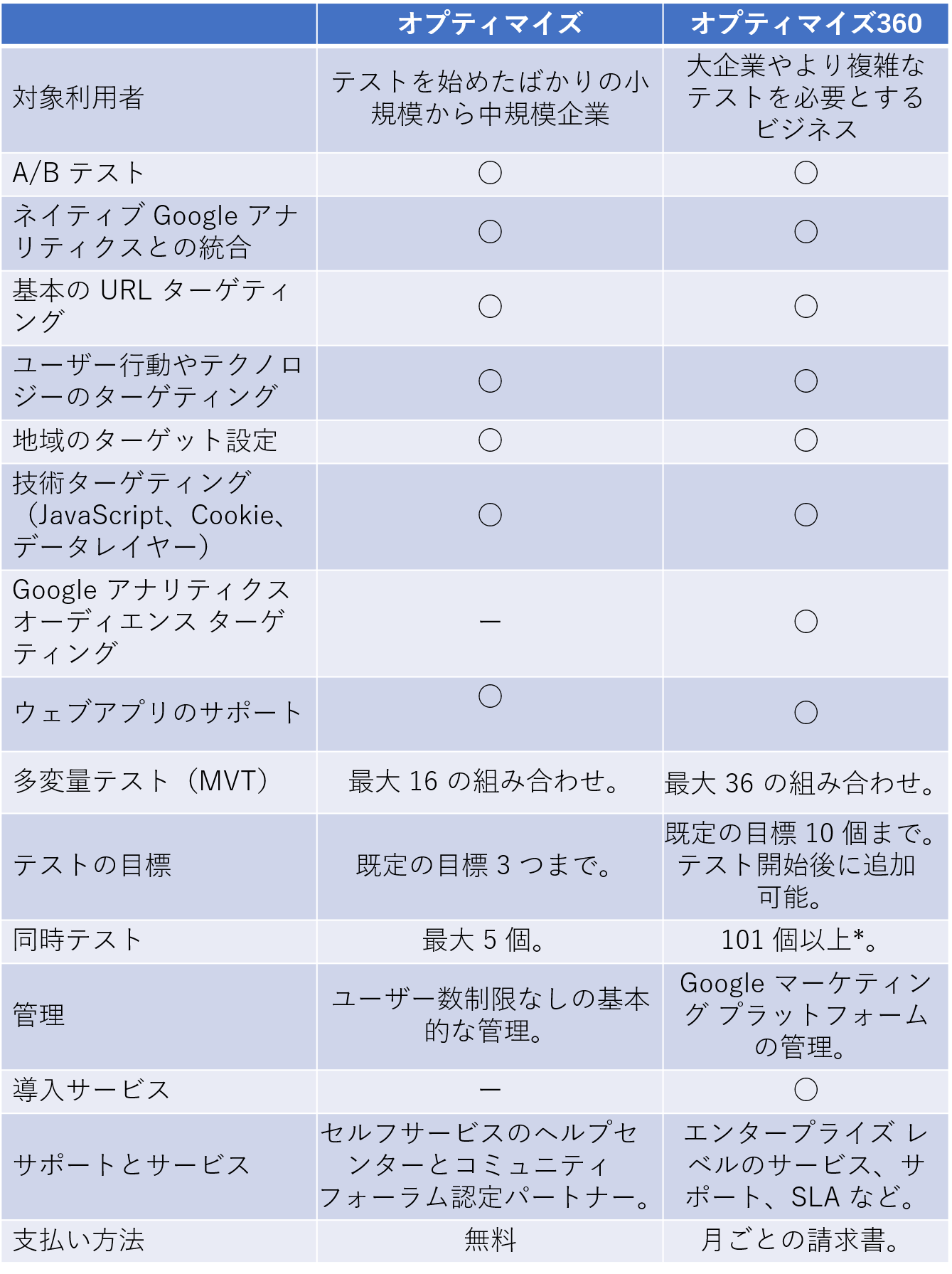 Googleオプティマイズには2種類あり冒頭にも書いたとおりオプティマイズが無料版オプティマイズ360が有料版です。それぞれ以下のような機能の違いがあります。無料でも役立つツールですが、企業規模やテスト内容によって有料版にすることも有効的かと思います。