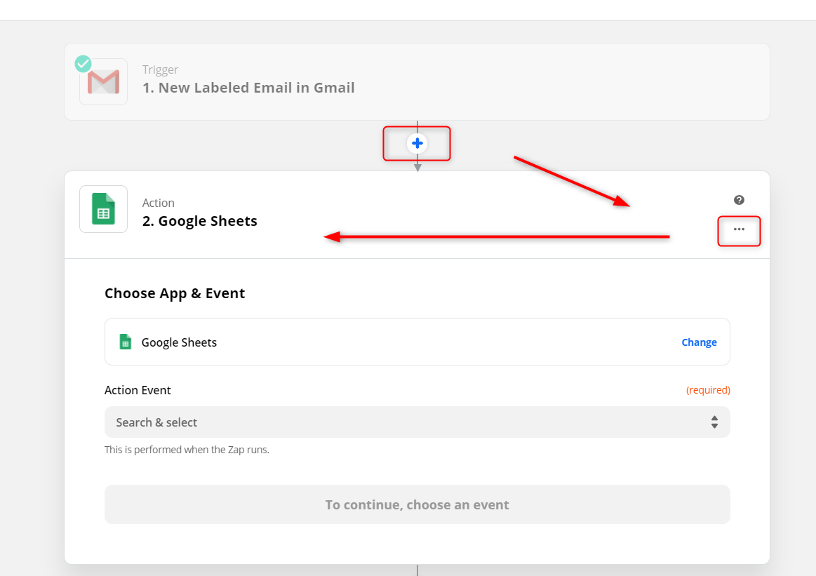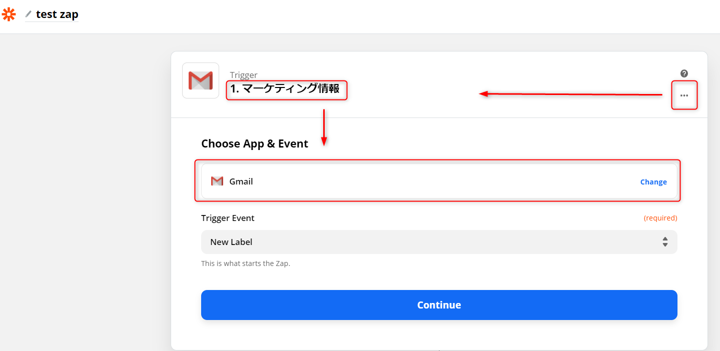 「Gmail」が選択できたら上記の画面になるので、右上の「…」を選択して、トリガー名を入力します。「Choose App & Event」でも同様に「Gmail」が選択されていることを確認します。