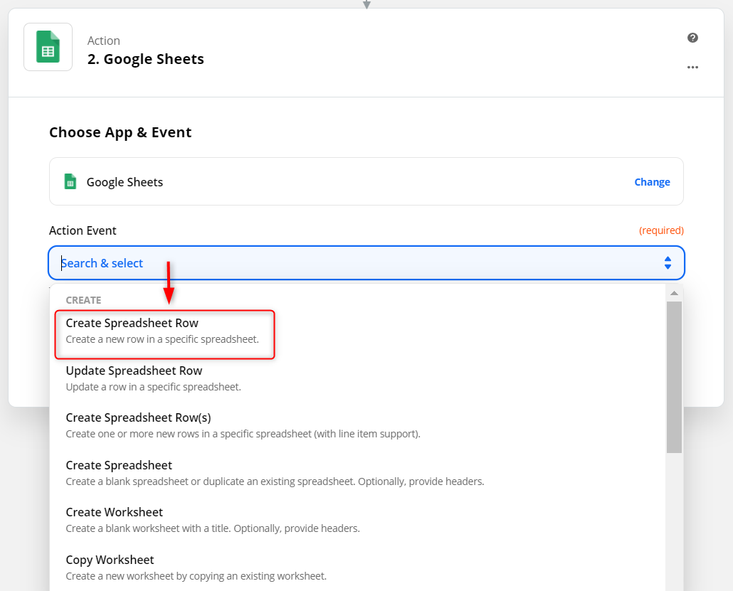 マーケティング情報関連のメールがきたらスプレッドシートに行を追加したいので「Action Event」から「Create Spreadsheet Row」を選択します。