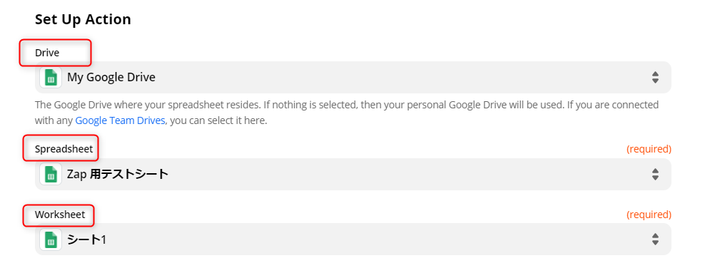 上から順に、「スプレッドシートが連携されているGoogle Drive」を選択し、次に情報を追加したい「スプレッドシート名」「ワークシート名」を選択します。