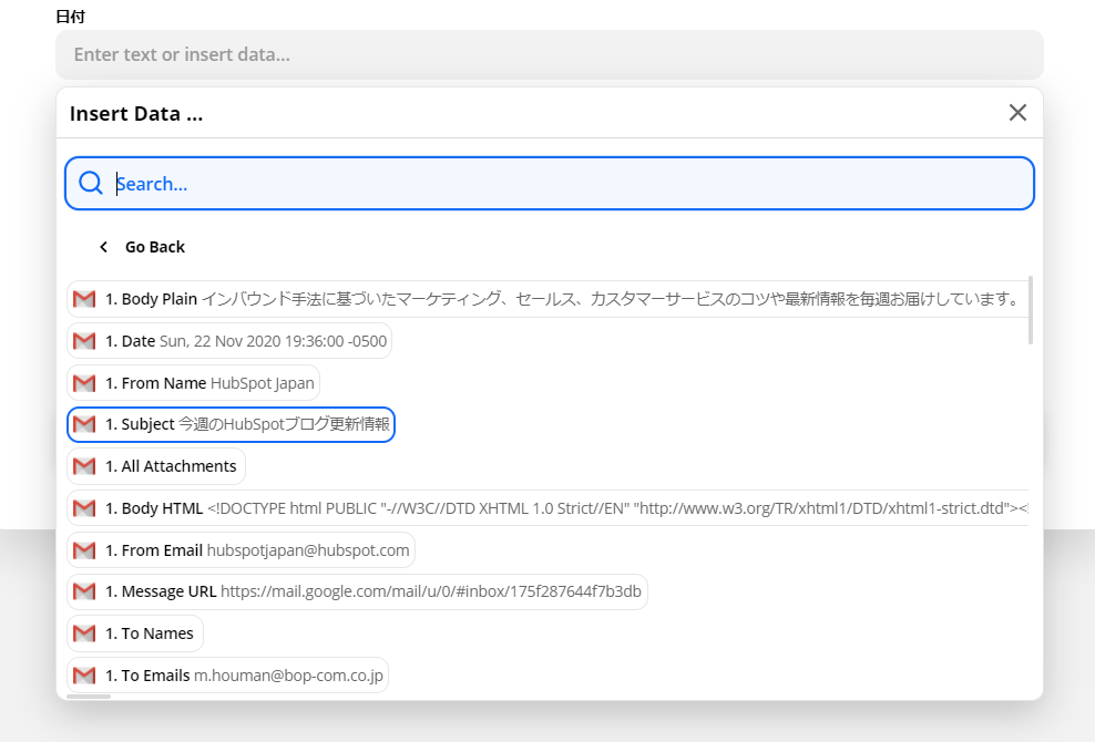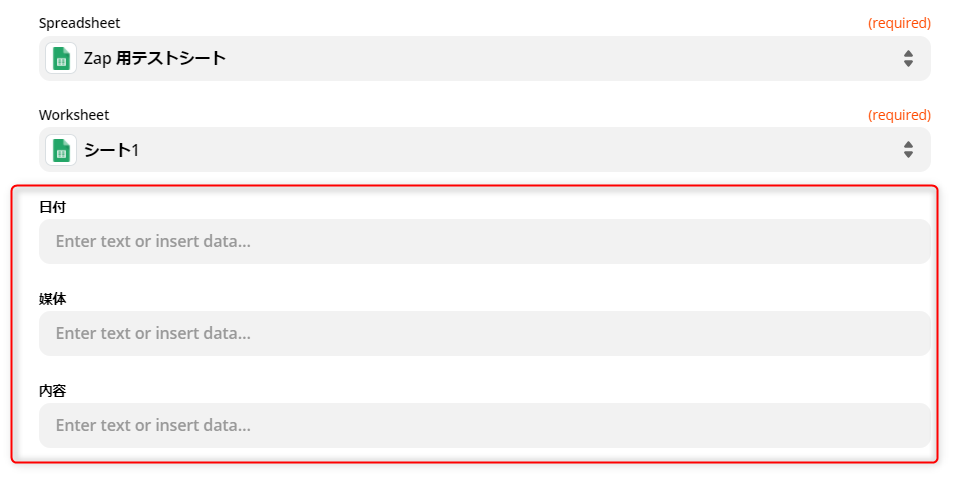 スプレッドシートに追加した項目名がそのままzapierにも反映されますので、それぞれの項目で確認したい内容を選択していきます。