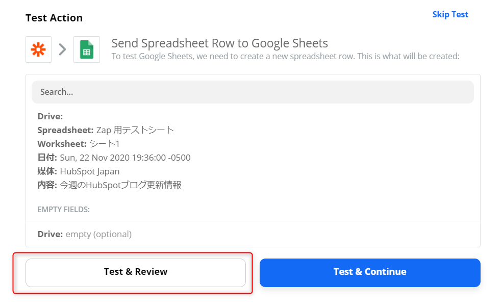 最後に「Test & Review」を選択し、スプレッドシートに反映されるか試します。