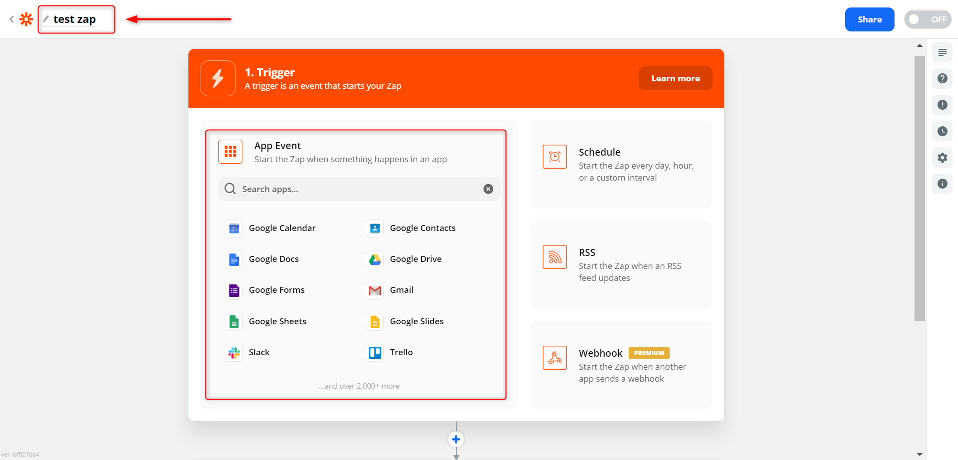 まず、こちらの画面で左上部分からこの自動化したい作業に名前をつけます。名前をつけたら、画面中央の「Trigger」を設定していきます。Googleタグマネージャーを使用する方なら馴染みがあるかもしれませんが、トリガーという部分です。今回は「Gmailにマーケティング情報の新着メッセージがきたら~」をアクションのきっかけにしたいので、中央の赤枠部分から「Gmail」を選択して下さい。