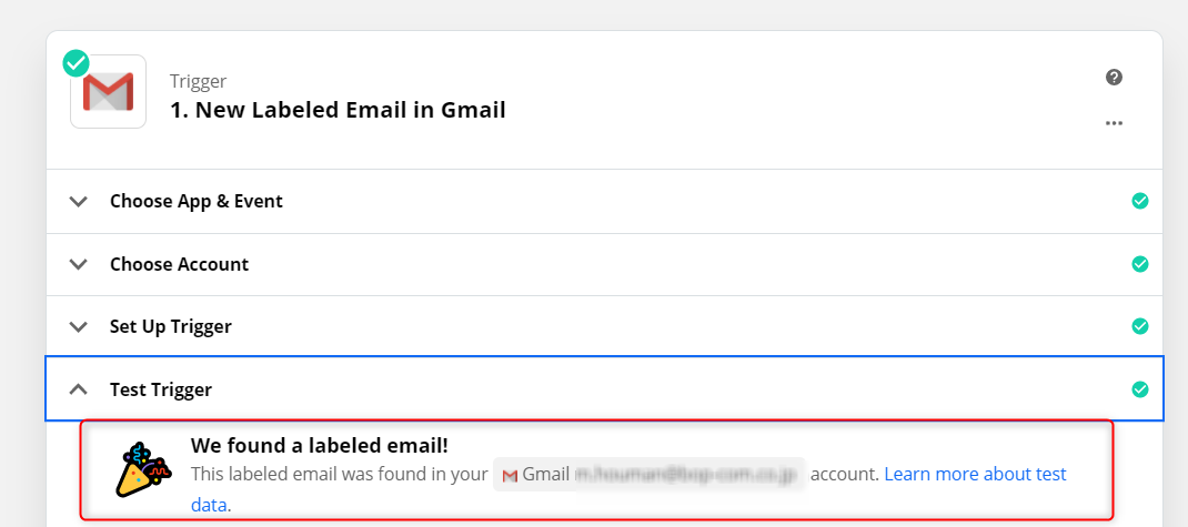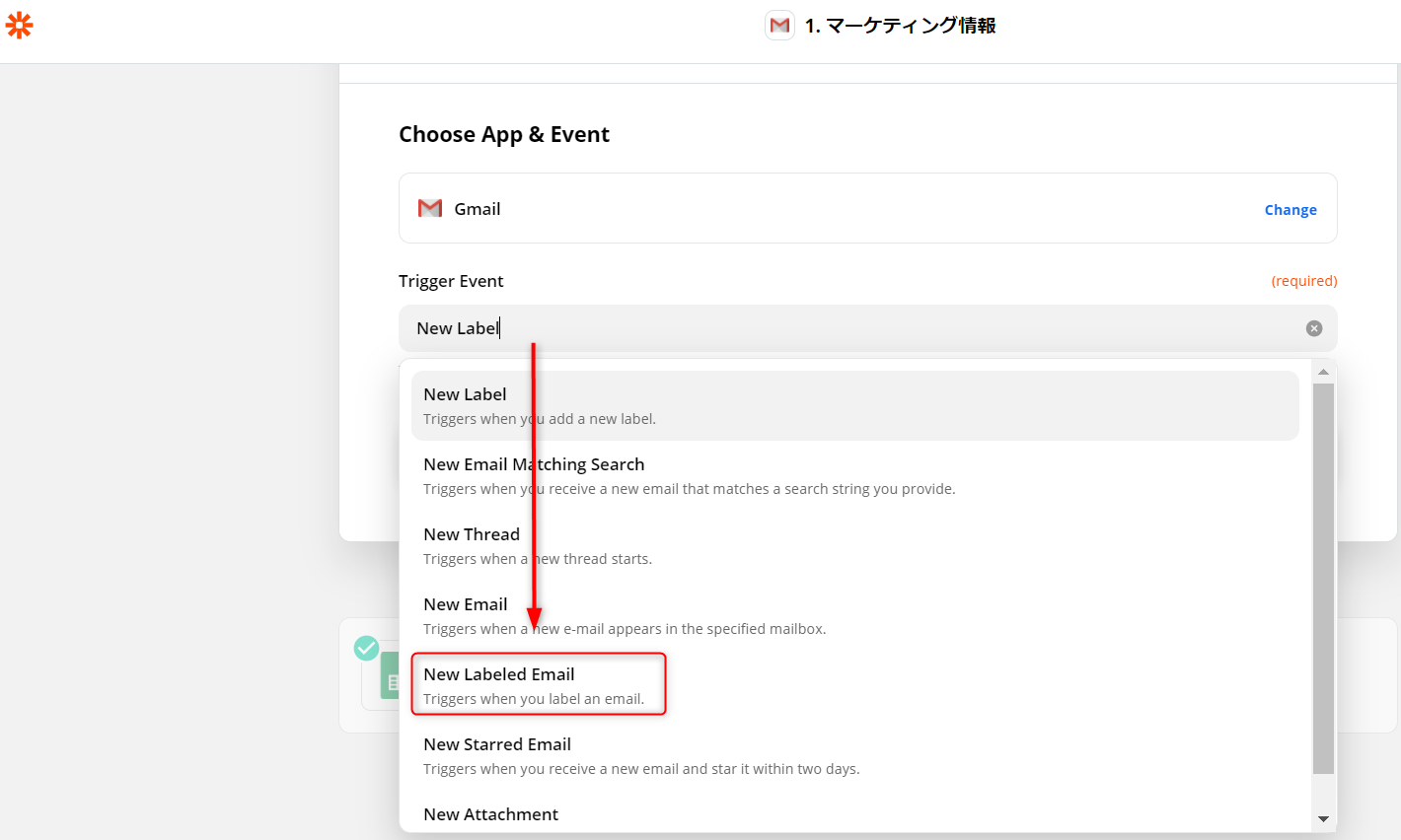 Gmail内で設定したラベルのついた新着メールのデータのみをスプレッドシートに引っ張りたいので「 Trigger Event 」から「 New Labeled Email 」を選択します。