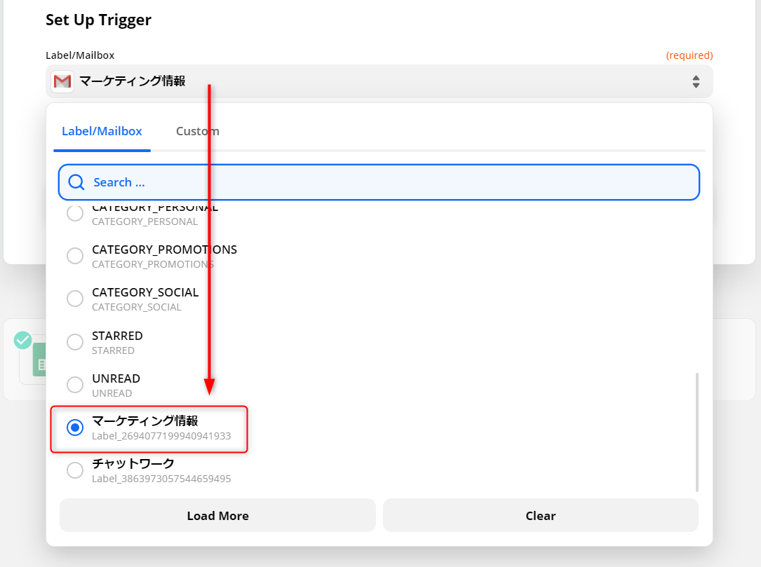 次の項目でGmail上で設定しているラベル一覧が表示されます。今回は事前に作成しておいた「マーケティング情報」というラベルを選択します。