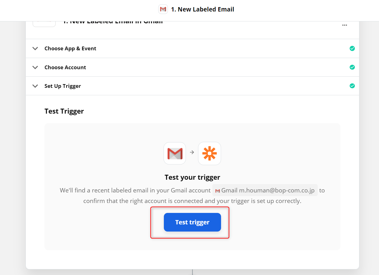 全て、選択ができたら最後に「Test trigger」で情報が正常に取得できるかテストをします。