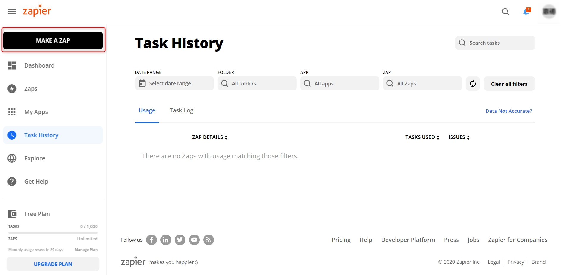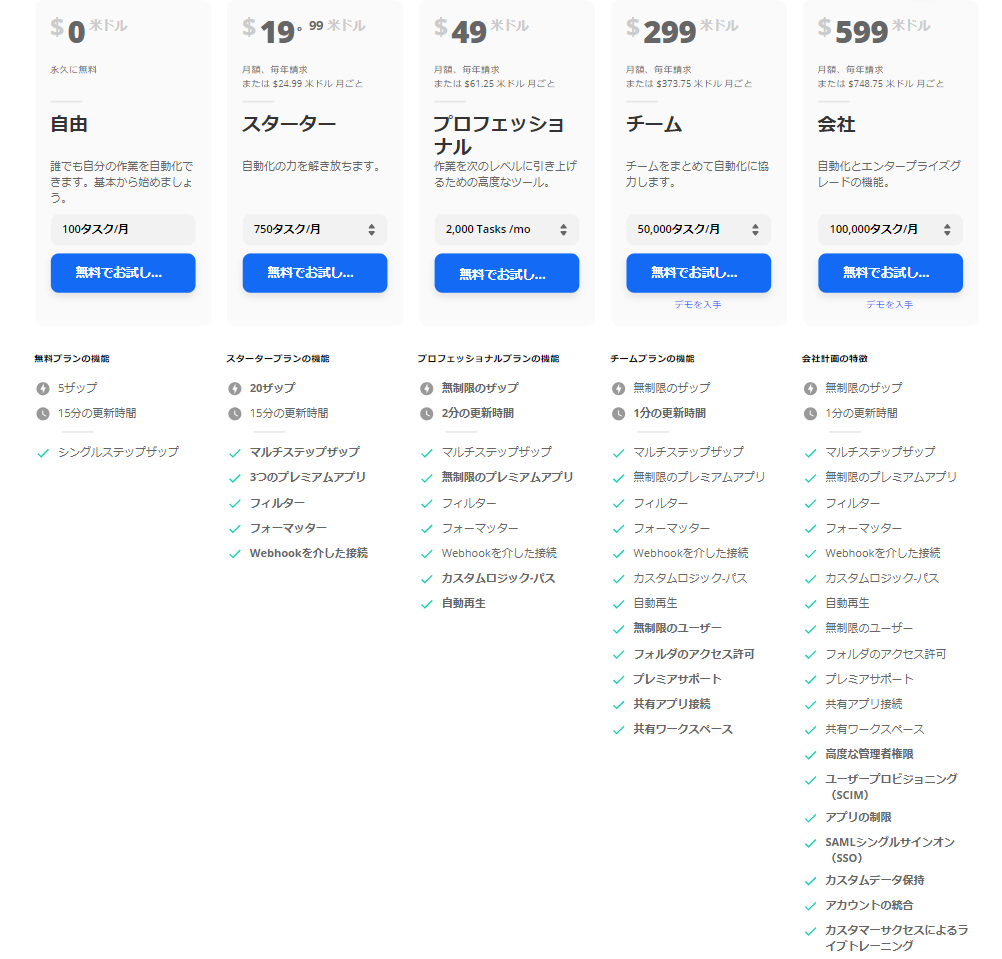 zapierの料金プランは1ヶ月内のタスク処理数や、Zap数(ワークフローのパターン数)、使用するツールやサービスにより変動します。使用するツールやサービスは限られますが、5ザップ以内で月に100タスクまでの処理なら無料プランで使用することができます。