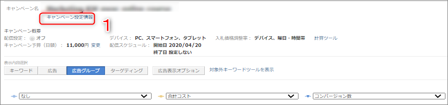 ①該当のキャンペーンを選択し、「キャンペーン設定情報」を選択します。