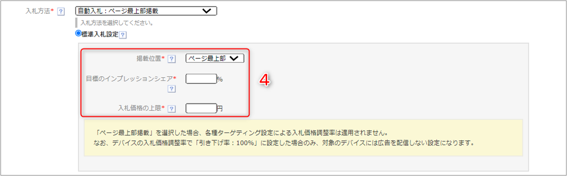 ③予算と掲載条件の入札方法から「自動入札:ページ最上部掲載」を選択します。