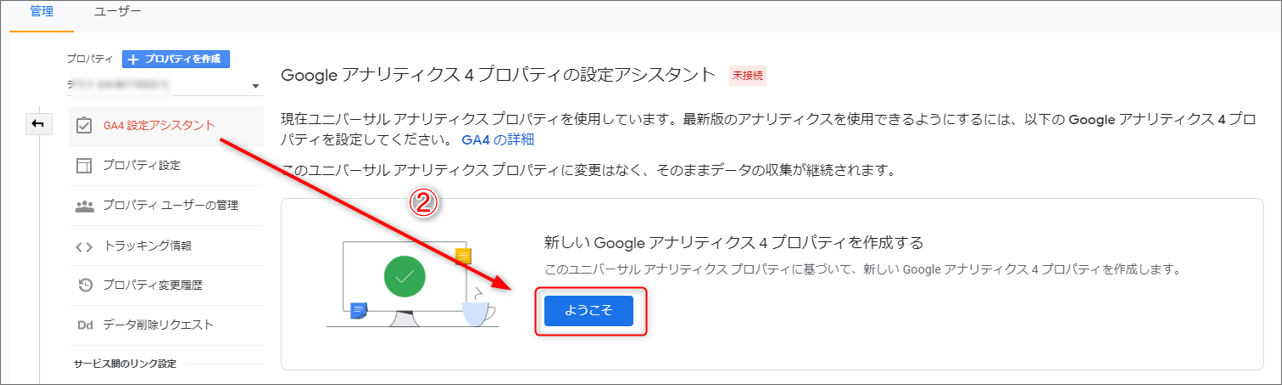 新しいGoogle アナリティクス4プロパティを作成するという画面が表示されるので、「ようこそ」を選択すると新規プロパティが作成されます。