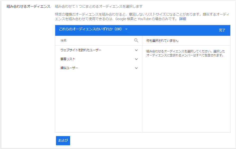 ここまでのオーディエンス設定は、Googleが用意したカテゴリから選択して配信するメニューが主です。