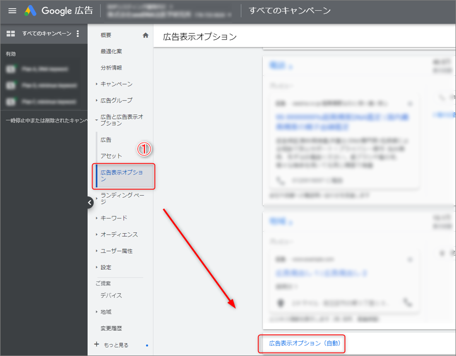 ①広告管理画面の「広告表示オプション」→各広告表示オプションの下のほうに「広告表示オプション(自動)」があるので選択します。