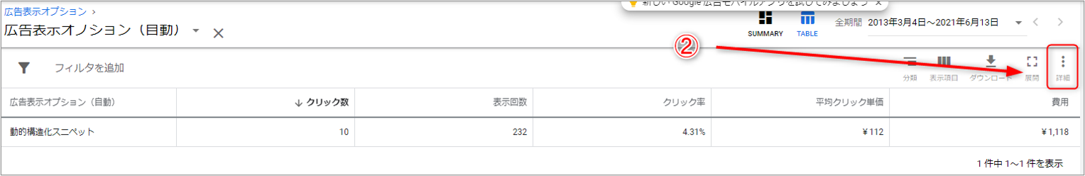 ②広告表示オプション(自動)が表示されたら右側にある「詳細」ボタンを選択します。