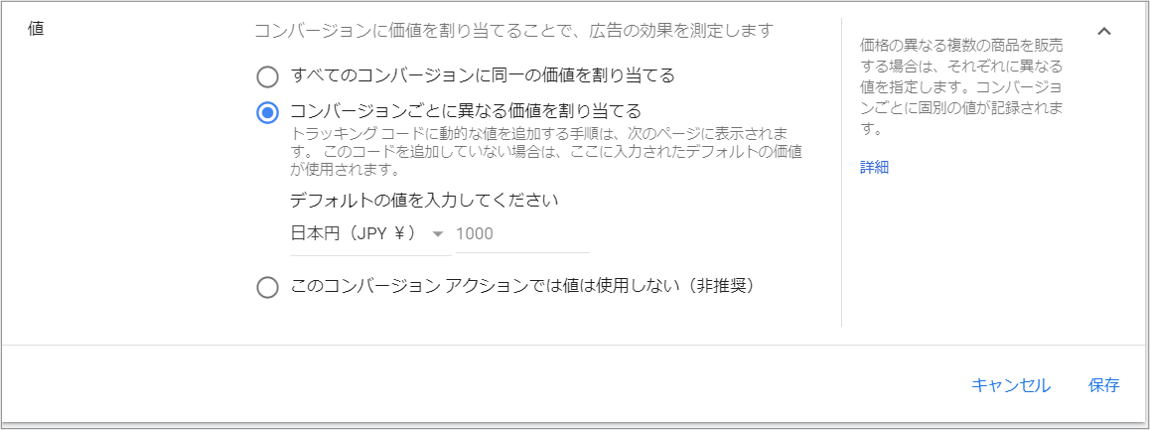 Google広告のコンバージョン設定画面から、コンバージョンポイントごとに売上を設定することで、広告の価値を把握することができます。