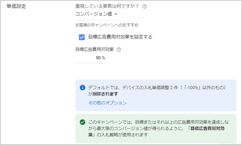 Google広告で費用対効果を重視した入札戦略を行いたい場合はキャンペーンの設定→単価設定から「目標広告費用対効果」を選択することができます。